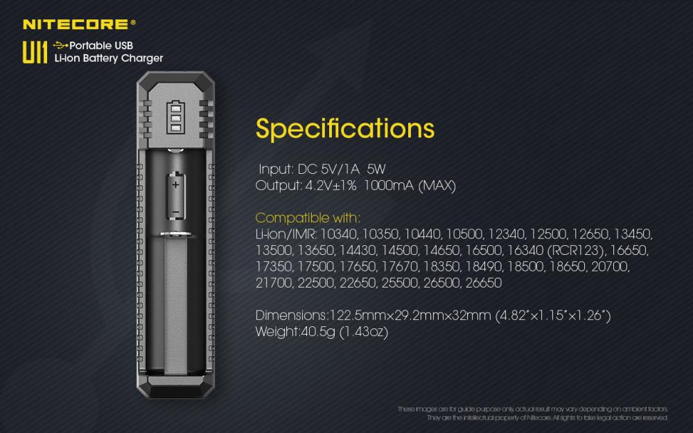 -kompatibilní s: Li-ion/IMR: 10340, 10350, 10440, 10500, 12340, 12500, 12650, 13450, 13500, 13650, 14430, 14500, 14650, 16500, 16340 (RCR123), 16650, 17350, 17500,17650, 17670, 18350, 18490, 18500, 18650, 20700, 21700, 22500, 22650, 25500, 26500, 26650
